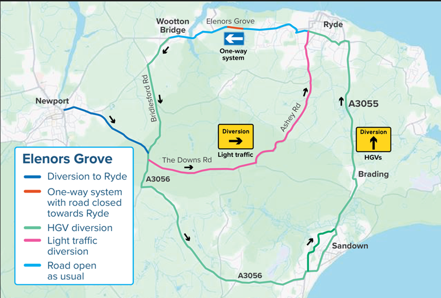 Light vehicles will be diverted through Newport to Ryde via The Downs Road and Ashey Road. HGV’s will be diverted through Newport to Ryde via the A3056 and A3055.